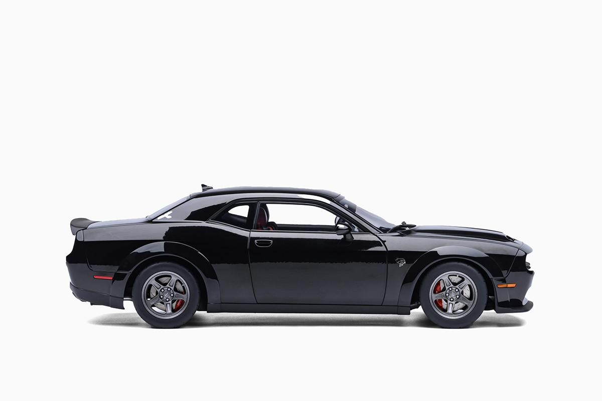 Unleash the beast with AUTOart's 1/18 scale model of the 2023 Dodge Challenger SRT Super Stock in sleek Pitch Black. This composite diecast replica combines an ABS exterior with a detailed diecast interior, offering exceptional craftsmanship and realism. Fully opening doors, hood, and trunk showcase a meticulously crafted engine bay, undercarriage with suspension and brakes, and exhaust details. Hand-polished finish, steerable wheels, and real rubber tires enhance its authenticity. Officially licensed, it embodies the Super Stock's dragstrip dominance with 807 horsepower inspiration, aggressive styling, and widebody flair. Ideal for enthusiasts, this dark, menacing model highlights Dodge's commitment to high-performance heritage in a collectible form.