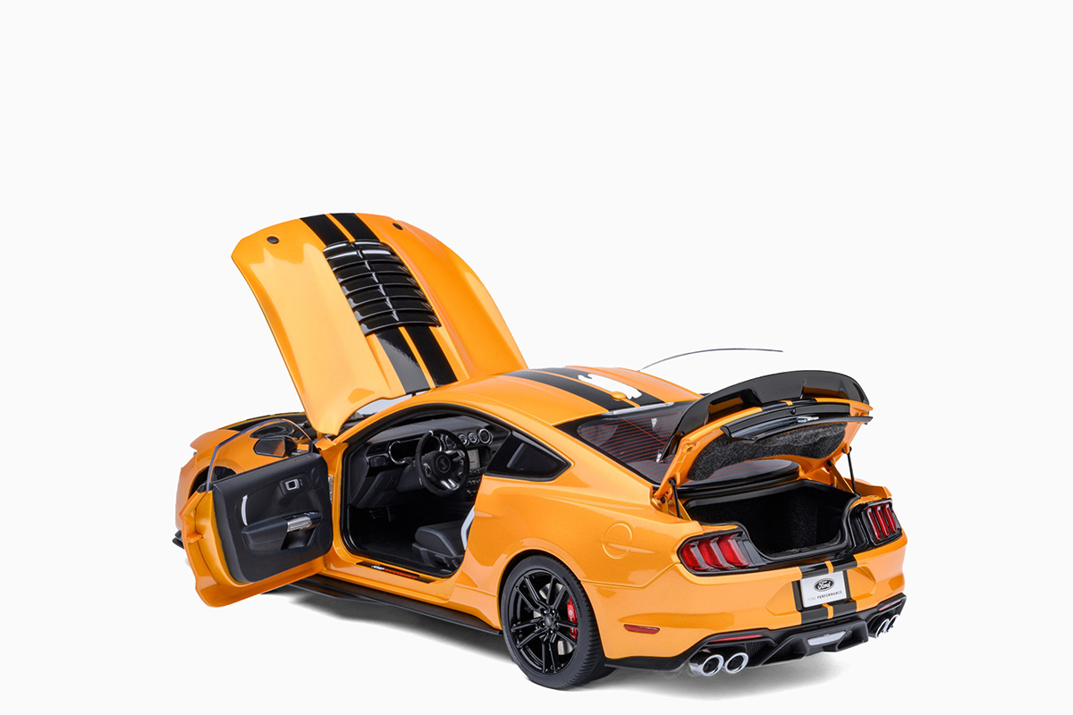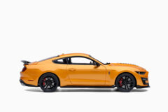Electrify your shelf with AUTOart's 1/18 scale Ford Mustang Shelby GT500 in bold Cyber Orange with black stripes. This premium composite model integrates an ABS body with a diecast interior for exceptional detail and value. Opening doors, hood, and trunk reveal a masterfully replicated supercharged V8 engine, detailed undercarriage, suspension, brakes, and exhaust. Includes steerable wheels, real rubber tires, and authentic interior accents. Officially licensed, it celebrates the GT500's 760 horsepower fusion of heritage and technology. Hand-polished to a brilliant finish, this orange powerhouse embodies Shelby's iconic presence, ideal for collectors seeking vibrant, high-performance replicas with unmatched precision.